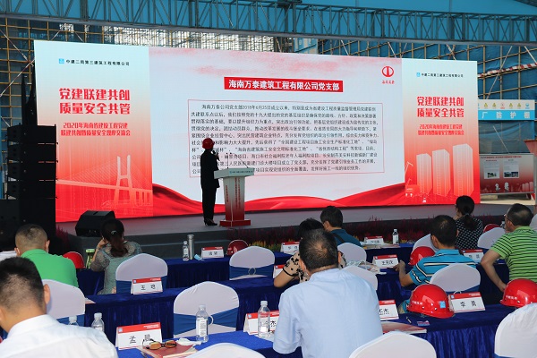 為了進(jìn)一步加強(qiáng)黨建聯(lián)系點(diǎn)的溝通交流,繼續(xù)深入推進(jìn)黨建聯(lián)創(chuàng)共建工作,鞏固抓黨建促工程質(zhì)量安全水平提升的成效。9月25日上午,2020年海南省建設(shè)工程黨建聯(lián)建共創(chuàng)暨質(zhì)量安全觀摩交流會在南光·西海灣項(xiàng)目部舉行。省住建廳機(jī)關(guān)黨委專職副書記劉志偉、省質(zhì)安局陳雷書記、省質(zhì)安局副局長劉長征、市質(zhì)安站站長符志明及各黨建聯(lián)創(chuàng)共建企業(yè)黨支部、新聞媒體等單位參加了此次活動(dòng)。海南萬泰公司黨支部作為省住建系統(tǒng)黨建聯(lián)系點(diǎn)參加了會議,并做了黨建工作經(jīng)驗(yàn)交流發(fā)言。