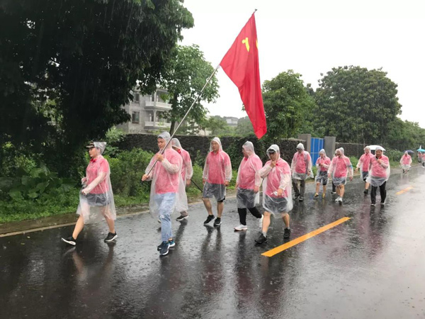 在突來的磅礴大雨中,大家依然堅持前行,努力完成10KM徒步目標。