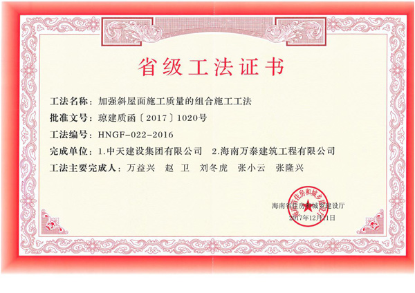 2017年12月5日,海南省住房和城鄉(xiāng)建設(shè)廳發(fā)布公告,公布了2016年度海南省省級(jí)工法名單。海南萬(wàn)泰建筑工程有限公司申報(bào)的兩項(xiàng)工法(定型化電梯井操作平臺(tái)提升架施工工法、加強(qiáng)斜屋面施工質(zhì)量的組合施工工法)名列榜單,且得票數(shù)均為13票,得票率百分之百。