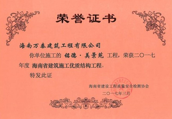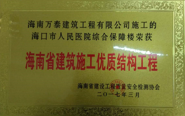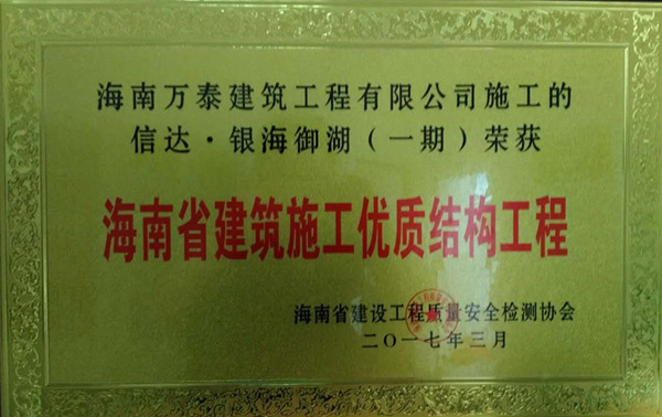 2017年6月20日,經(jīng)過了長(zhǎng)期的嚴(yán)格評(píng)審之后,由海南萬泰承建的海口市人民醫(yī)院綜合保障樓、瓊海信達(dá)銀海御湖(一期)、銘德.美景苑三個(gè)項(xiàng)目全部通過基礎(chǔ)、主體階段的評(píng)審,并榮獲海南省建設(shè)工程質(zhì)量安全檢測(cè)協(xié)會(huì)頒發(fā)的《海南省建筑施工優(yōu)質(zhì)結(jié)構(gòu)工程》證書。至此,繼“藍(lán)城商務(wù)大廈 ”榮獲“椰城杯”后,萬泰工程再斬殊榮。值得一提的是,這已經(jīng)是萬泰本年度第三次榮獲相關(guān)獎(jiǎng)項(xiàng)。