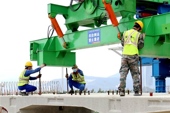 據(jù)介紹,預(yù)制構(gòu)件在中交二航局中山預(yù)制廠集中預(yù)制,經(jīng)過171公里船舶海運(yùn)和3公里陸運(yùn)至施工現(xiàn)場,采用中交二航局自主研發(fā)的TP120預(yù)制裝配式一體化架橋機(jī)進(jìn)行裝配施工。該架橋機(jī)具有施工過程占地面積小、對(duì)沿線地面運(yùn)輸條件要求低、操作平臺(tái)和調(diào)位系統(tǒng)精確可靠,以及上下部構(gòu)件可同時(shí)安裝連接等優(yōu)勢,特別適用于城市交通繁忙地區(qū)的市政橋梁工程建設(shè)。