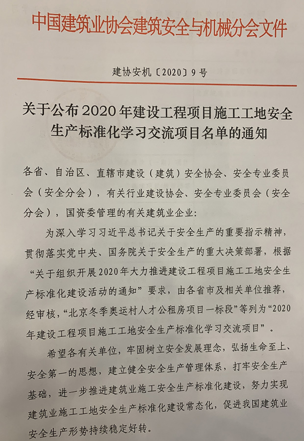 近日,建筑業(yè)安全生產(chǎn)管理經(jīng)驗(yàn)交流會(huì)在北京鐵道大廈召開(kāi)。本次會(huì)議由中國(guó)建筑業(yè)協(xié)會(huì)建筑安全與機(jī)械分會(huì)主辦,會(huì)議旨在貫徹落實(shí)黨中央和國(guó)務(wù)院關(guān)于安全生產(chǎn)的重大決策部署和住房和城鄉(xiāng)建設(shè)部對(duì)建筑業(yè)安全生產(chǎn)的新要求,發(fā)揮專(zhuān)家的作用,踐行科技引領(lǐng)、有效預(yù)防,分享經(jīng)驗(yàn),實(shí)現(xiàn)安全生產(chǎn)的目標(biāo)。會(huì)上公布了2020年全國(guó)建設(shè)工程項(xiàng)目施工工地安全生產(chǎn)標(biāo)準(zhǔn)化建設(shè)學(xué)習(xí)交流項(xiàng)目名單,我公司承建的兆南熙園(南區(qū)四期)喜獲“2020年全國(guó)建設(shè)工程項(xiàng)目施工工地安全生產(chǎn)標(biāo)準(zhǔn)化”殊榮。