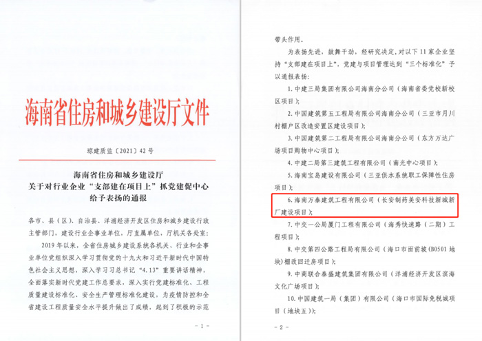 陽春三月春意濃,牛年大吉開門紅!喜慶春節(jié)剛過,迎來十四五開局,恰逢全國“兩會”勝利召開之際,海南萬泰建筑工程有限公司長安制藥美安科技新城新廠建設(shè)項目榮獲海南省住房和城鄉(xiāng)建設(shè)廳對“支部建在項目上”抓黨建促中心工作通報表揚,全省共11家企業(yè)獲得此殊榮,海南萬泰為獲表彰的民企之一。