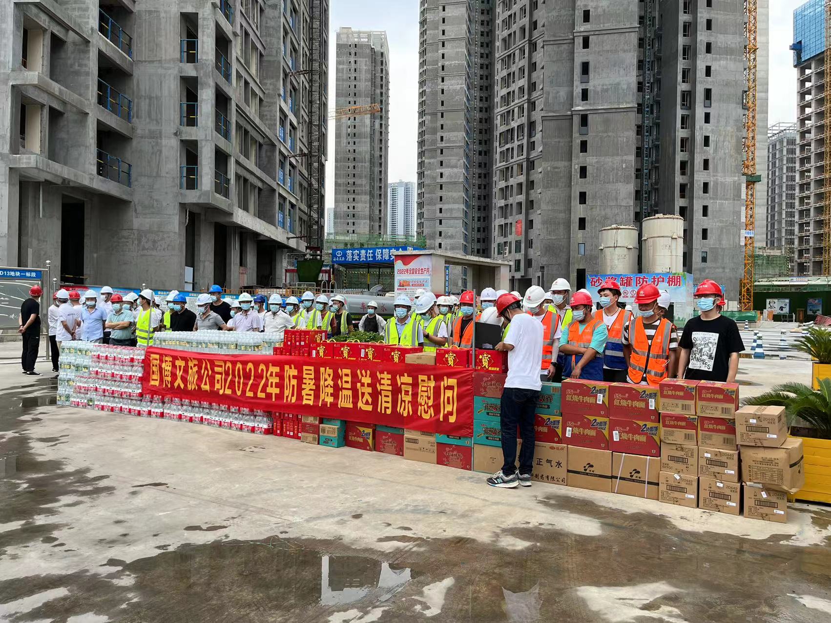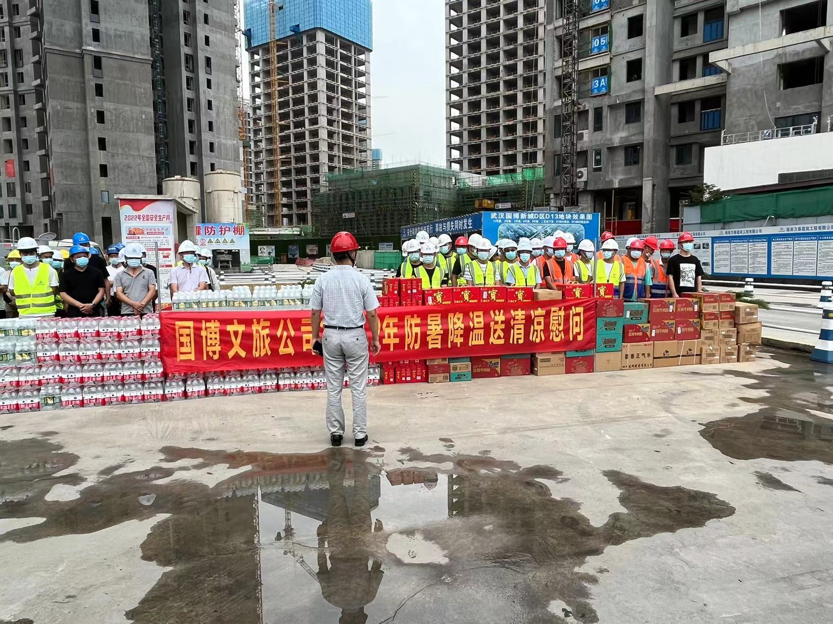 活動上,武漢國博文旅副總經(jīng)理江立偉對在炎熱天氣里仍然堅守在一線崗位上的廣大工友們表示慰問和感謝,并叮囑大家注意防暑降溫,提高防范意識,保護(hù)好自身安全。同時要求所有項目管理人員關(guān)心工地一線工人的身體健康,認(rèn)真做好防暑降溫工作,嚴(yán)格落實各項安全生產(chǎn)措施,確保安全生產(chǎn)工作有條不紊。