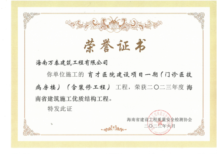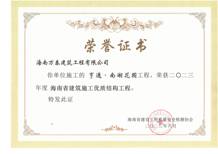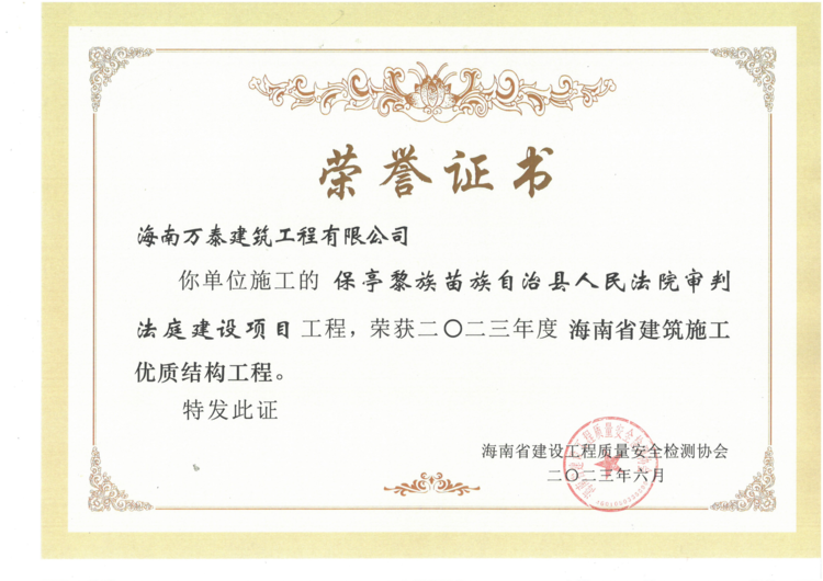 近日,由公司承建的育才醫(yī)院建設(shè)項(xiàng)目一期、保亭黎族苗族自治縣人民法院審判法庭建設(shè)項(xiàng)目、亨通·南湖花園分別通過(guò)了海南省建設(shè)工程質(zhì)量安全檢測(cè)協(xié)會(huì)的評(píng)審,被評(píng)為“2023年度海南省建筑施工優(yōu)質(zhì)結(jié)構(gòu)工程”。該獎(jiǎng)項(xiàng)代表著全省建筑工程結(jié)構(gòu)施工質(zhì)量的領(lǐng)先水平,是精品工程的重要標(biāo)志。