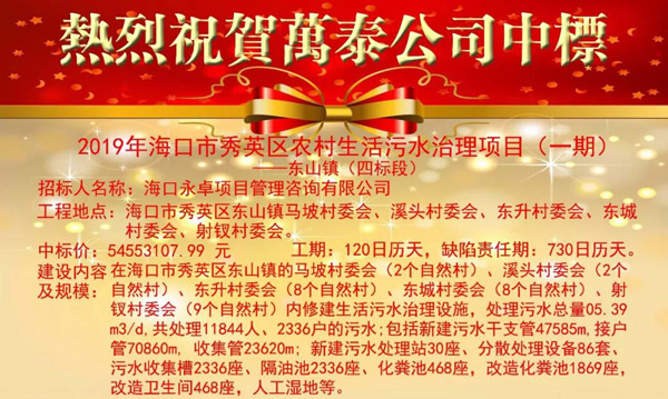 熱烈祝賀海南萬(wàn)泰中標(biāo)2019年海口市秀英區(qū)農(nóng)村生活污水治理項(xiàng)目(一期)-東山鎮(zhèn)(四標(biāo)段)
