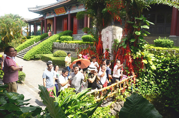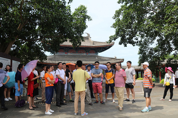認真聽導(dǎo)游講解玉蟾宮的文化特色
