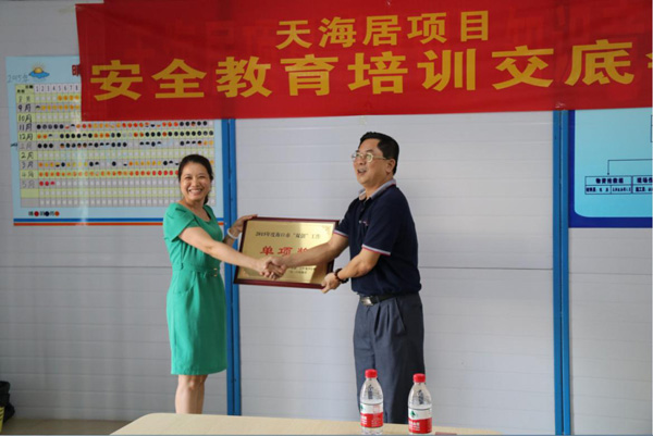 由海口市建設(shè)工程質(zhì)量監(jiān)督站副站長(zhǎng)吳坤順為“天海居”項(xiàng)目頒獎(jiǎng)。